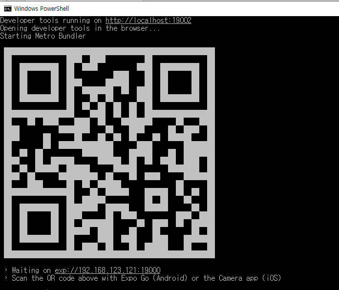 이를 설치 후 실핼하여 카메라로 이 QR 코드를 찍으면 방금 생성한 리액트 네이티브 앱이 핸드폰에서 실행 됩니다.