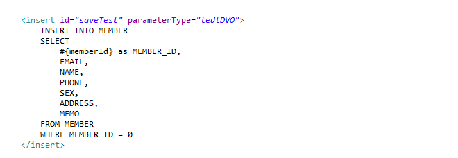 각각의 칼럼에 넣어주는데 #{memberId}는 VO에 저장 되어 있는 값으로 저장 됩니다.