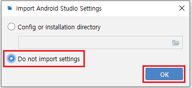 안드로이드 스튜디오를 처음 실행하면 기존 설정 정보를 읽어 들일 것인지 여부를 지정할 수 있습니다.