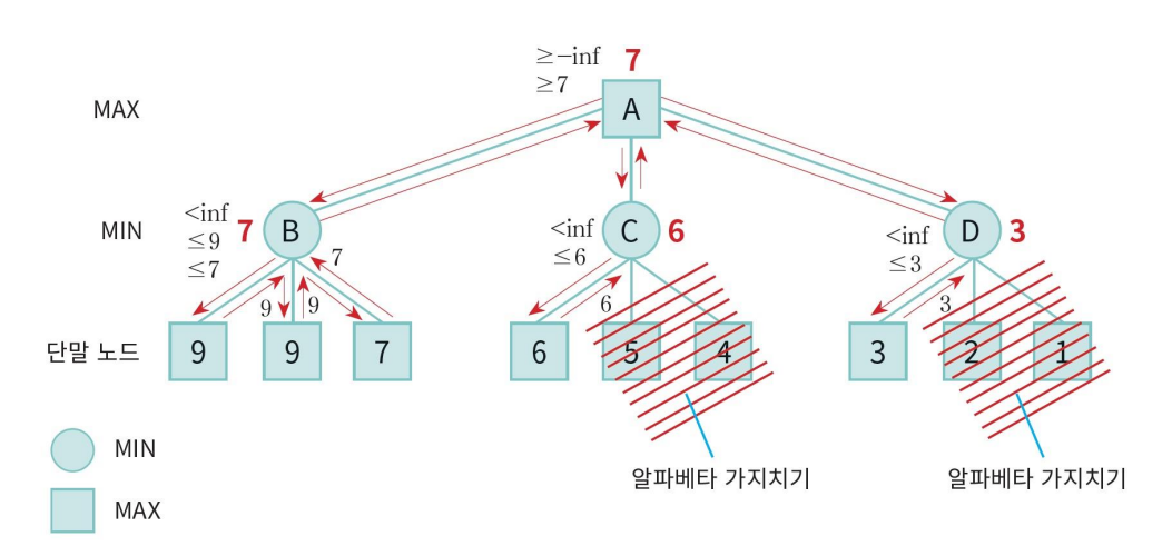 MINIMAX알고리즘에서 형성되는 탐색 트리 중에서 상당 부분은 결과에 영향을 주지 않으면서 가지들을 쳐낼 수 있다.