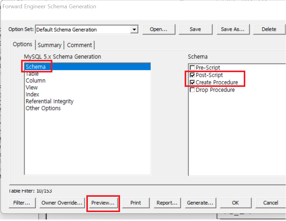 Schema의 post-Scipt와 Create Procedure를 체크하고 Preview를 클릭한다