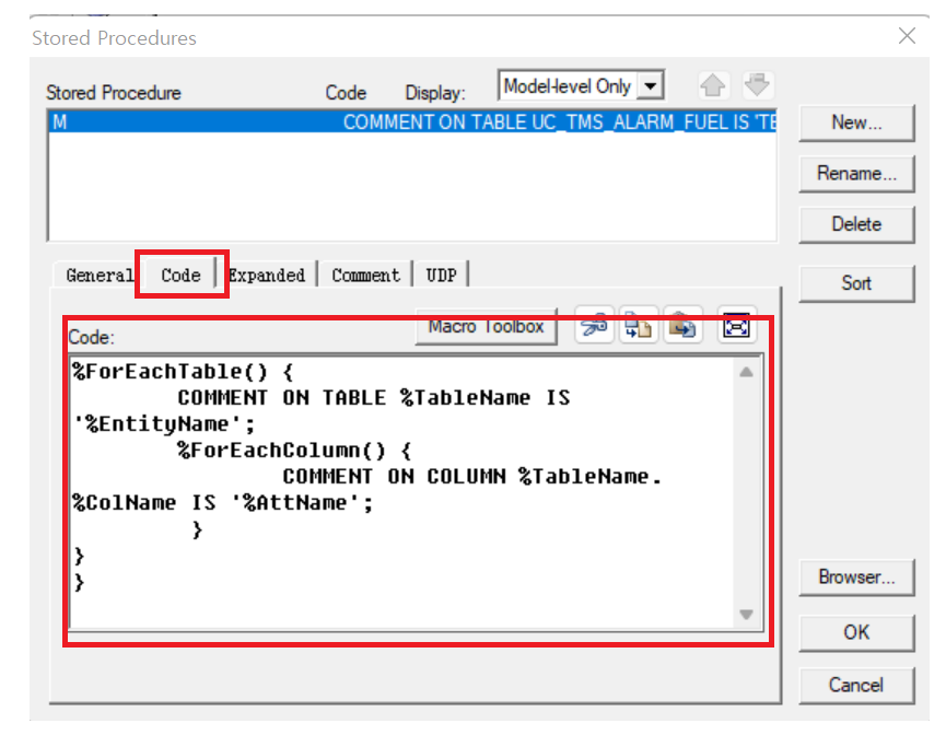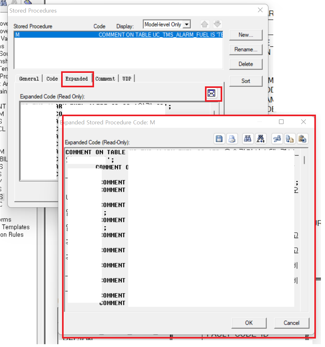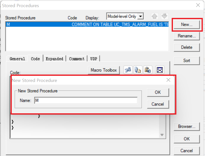 2. Stored Procedures 창이 나오면 New -> 이름 지어주고 (ex) M) -> OK 를 클릭한다