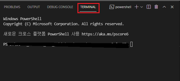 [Terminal-> New Terminal] 메뉴나 단축키[Ctrl+Shift+`(역 따옴표)]를 누르면 아래와 같이 터미널 창이 나타납니다.