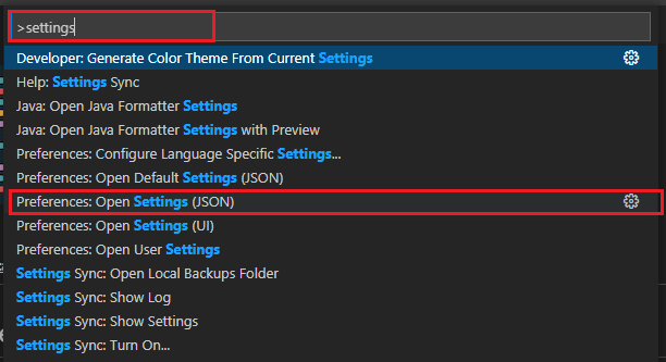 'settings'로 검색한 명령 중[기본 설정:설정 열기(JSON)]를 선택해 settings.json 파일을 열어줍니다.