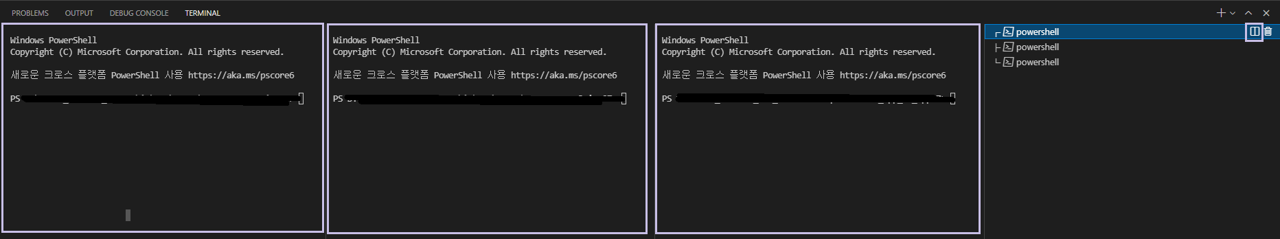 터미널 우측 상단에 + 아이콘을 클릭 해 터미널을 더 열 수 있고,
