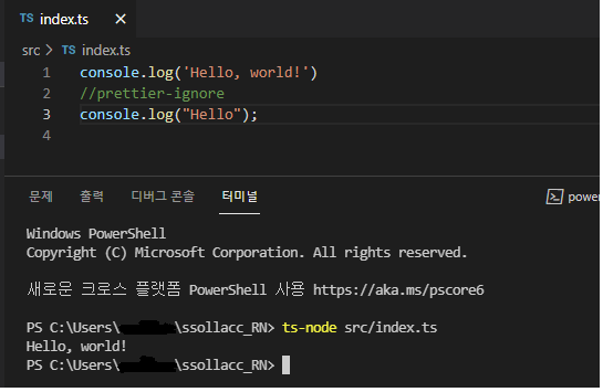 다음 명령으로 src/index.ts 파일을 실행해보면 실행 결과를 터미널에서 볼 수 있습니다.