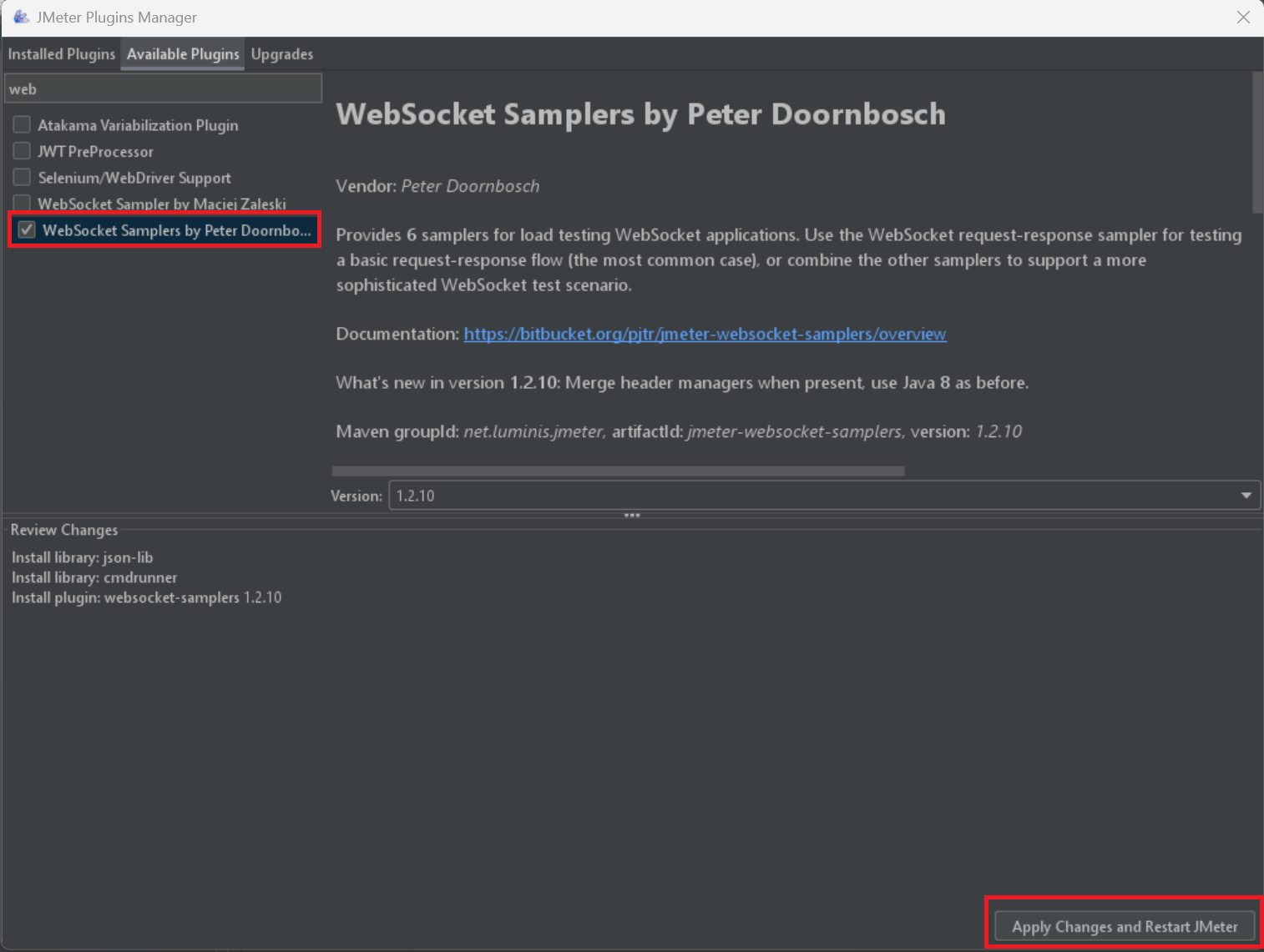 5. JMeter Plugins Manager > Available Plugins 탭에서 WebSocket Samplers by Peter Doornbosch 다운
