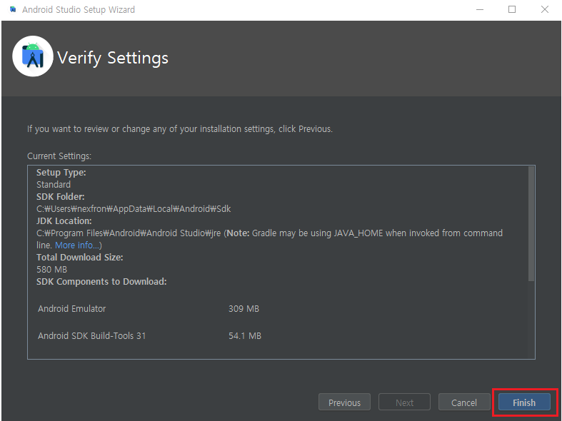 앞선 단계들에서 선택한 내용들을 확인하고 Finish!