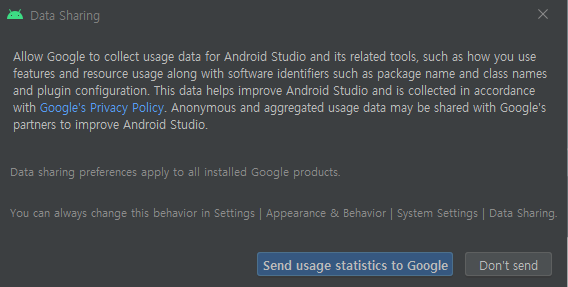 '사용 데이터 공유' 여부에 대한 설정 대화 상자입니다.