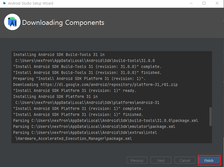 모든 설치가 완료되면 로그 메시지와 함께 'Finish' 버튼이 표시됩니다!