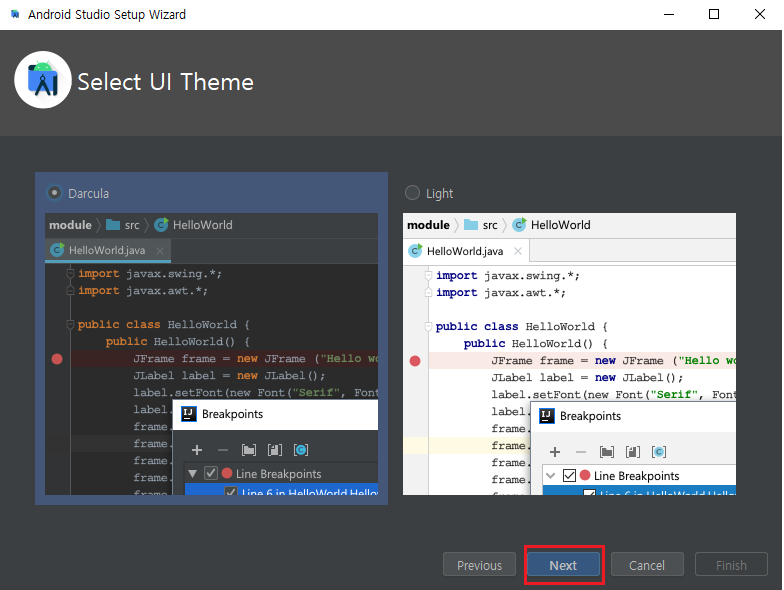 UI 테마를 설정하는 화면입니다. 취향에 맞게 어두운 계열(Darcula)과 밝은 계열(IntelliJ)을 선택합니다.